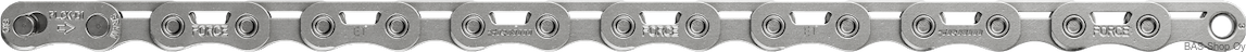 The all-new SRAM Force® chain was redeveloped from the ground up. The unique link shape allows the chain to be narrower and lighter while increasing strength and providing more space between the outer plates of the chain and the cogs on either side. Result: a quieter chain with faster, more precise shifts.