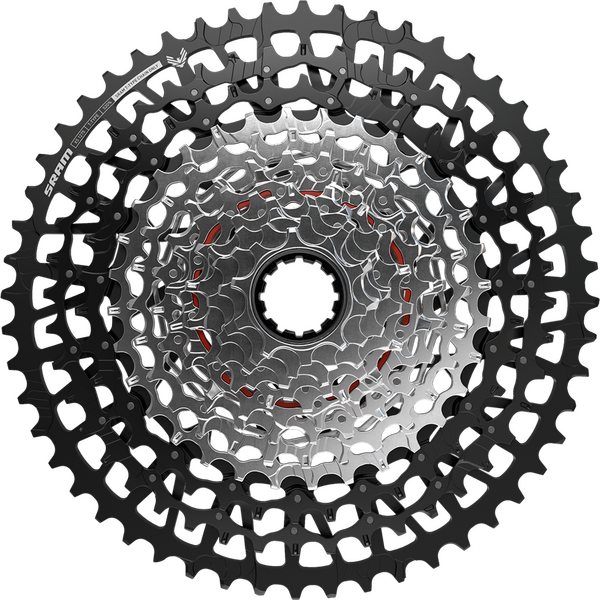 520% range. Full X-SYNC for best-ever inboard and outboard shifting performance under load. Optimized gear steps on low end. 55mm chainline compatibility for more moderate chain angle, longer wear and greater precision. Setup Cog for simple set up. Features a combination Pindome and MINI-CLUSTER design